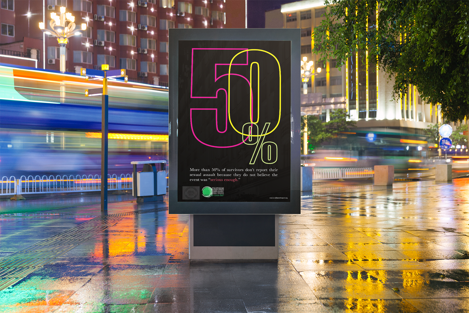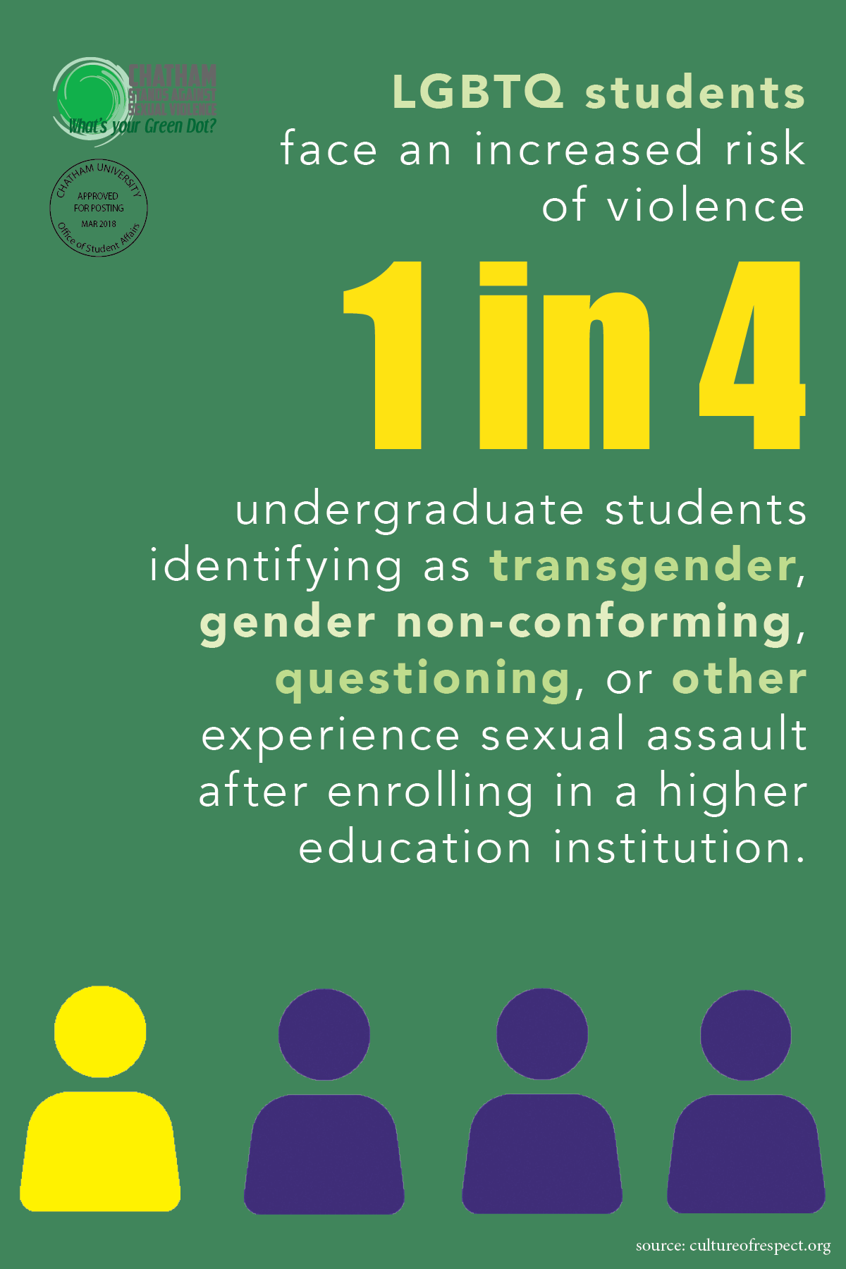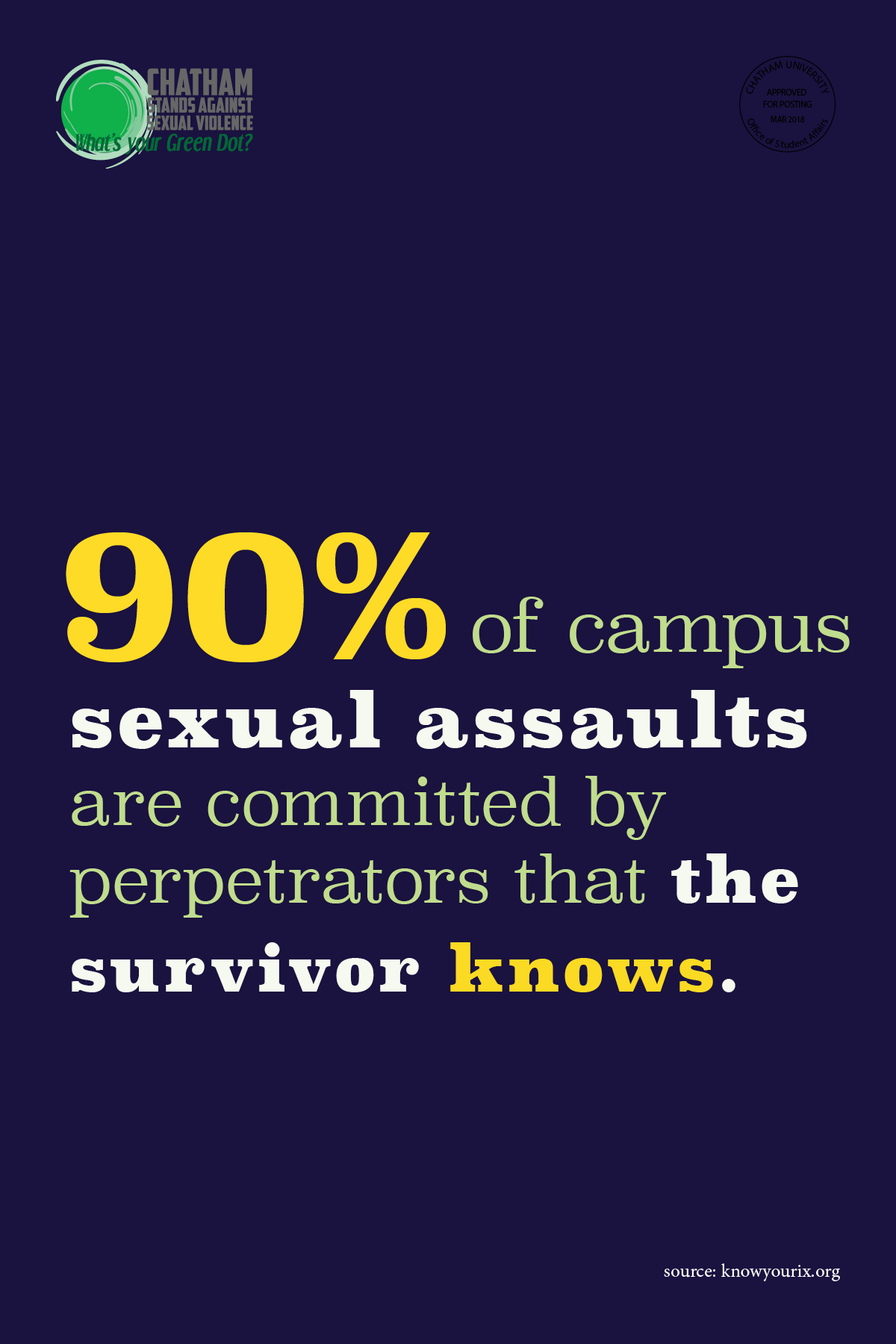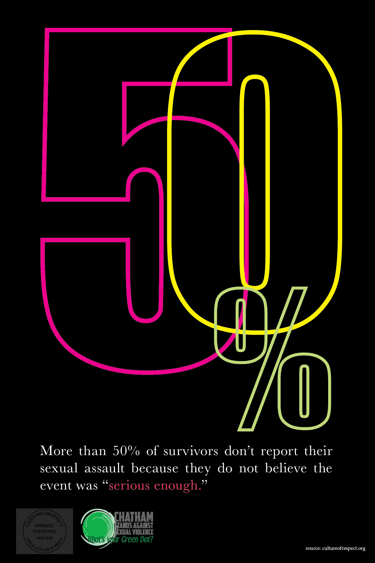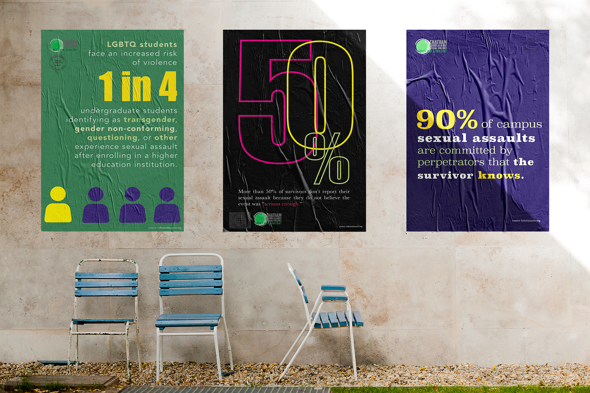 Chatham University wanted to create awareness for Sexual Assault Awareness Month in April. I designed a series of informational posters that were hung throughout campus and made into table tents for all cafeterias. Each poster has a shocking statistic about sexual health and violence to make the passerby pause to take in the information.